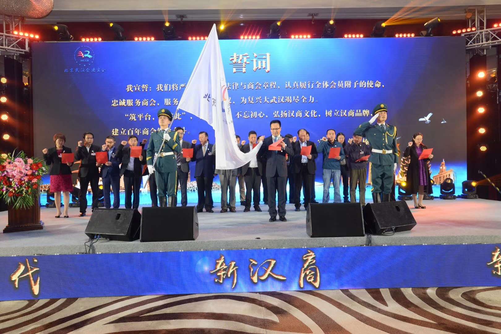 換屆慶典上,商會隆重舉行了以“新時代 新漢商 新篇章”為主題的第二屆領導班子就職儀式。在新班子的就職儀式上,伴著慷慨激昂的音樂,兩名國旗護衛隊隊員將北京武漢企業商會會旗緩緩護送到大會現場。新任會長戴彥榛先生帶領商會第二屆領導班子成員,在全體會員、與會嘉賓和有關媒體的見證下,在臺上執旗舉拳進行了莊嚴宣誓,凸顯了商會新一屆領導班子集體堅定的政治信念、強烈的責任感和使命感。隨后舉行了授牌儀式及“新漢商聯盟”發起儀式。
